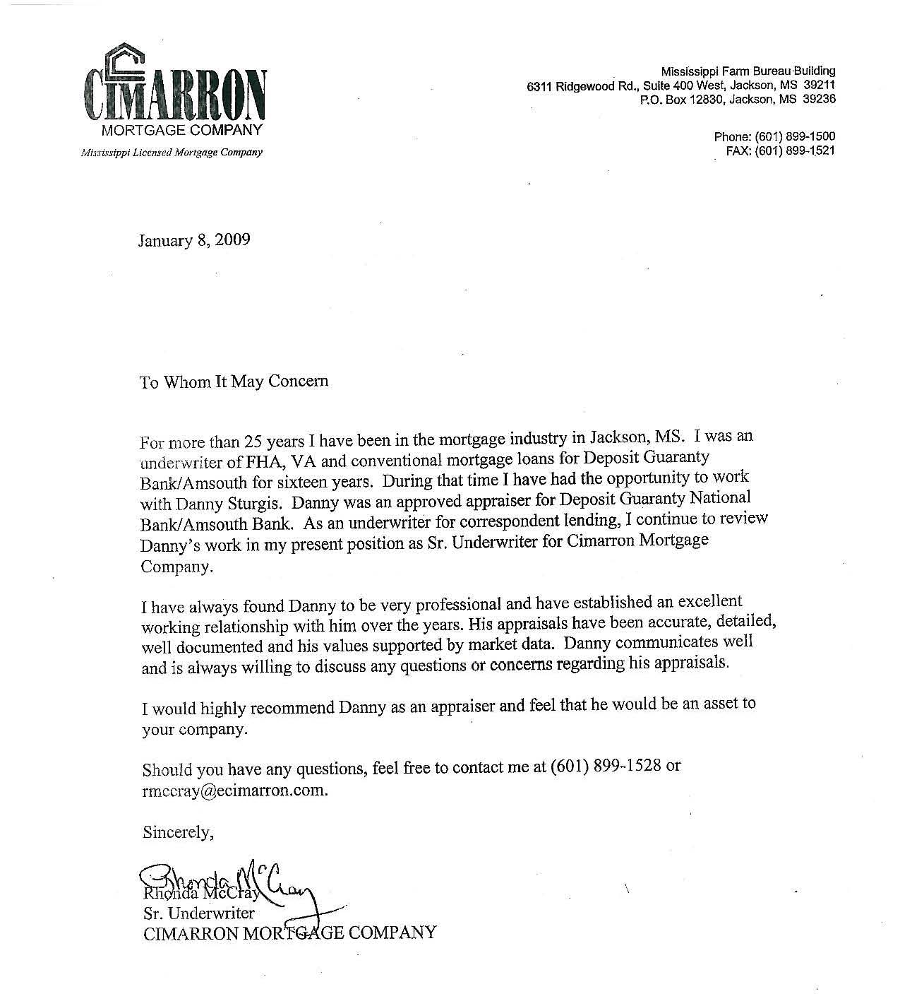 I have been an underwriter with Realty Mortgage Corp. since 1997. Before I was a review appraiser and construction analyst with the VA in Little Rock, AR and Jackson, MS having retired in 1997. I have reviewed Appraisal Analyst work since 1997. The work is always timely and the reports are very professional. I would recommend them to be on your appraisal fee panel. Please feel free to call me a (601) 933-0332 if you have any questions or comments.