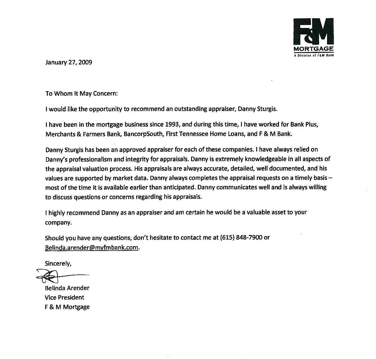 This is my letter of recommendation for Appraisal Analyst to be included on you list of professional appraisers. I have reviewed Appraisal Analyst appraisals for many years and have always done an excellent job.