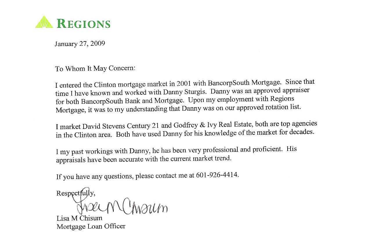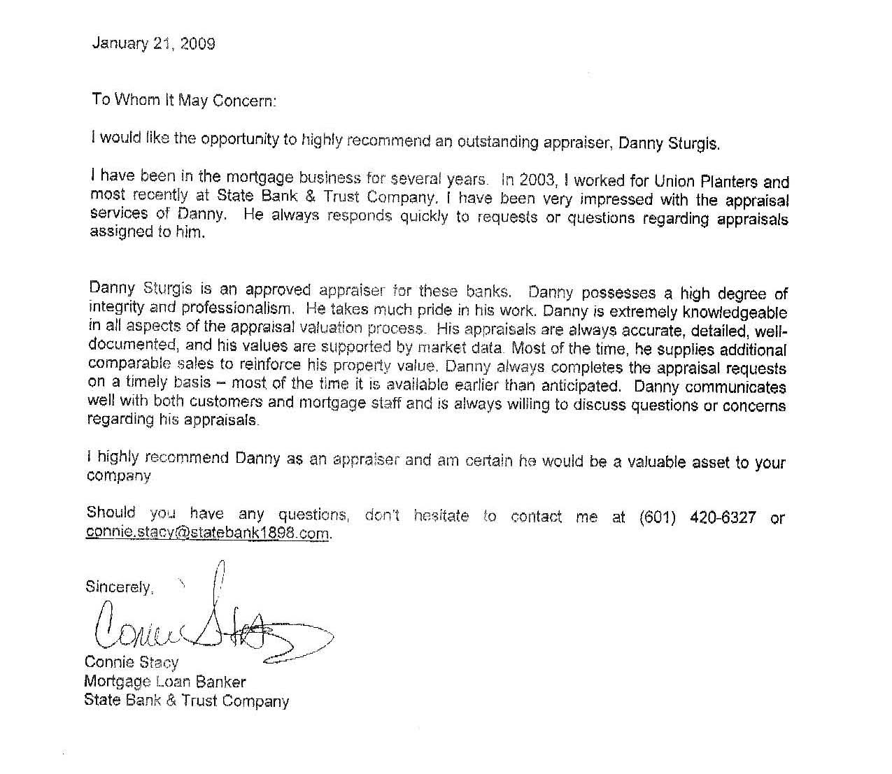 I have been in the banking business for 19 years and have dealt with Appraisal Analyst over the entire time period. The work has proven to be reliable, professional, and accurate. I have not experienced an appraisal related problem with a loan using Appraisal Analyst. I would highly recommend Appraisal Analyst to your organization. Should you need further information, please contact me at 601.926.0005.