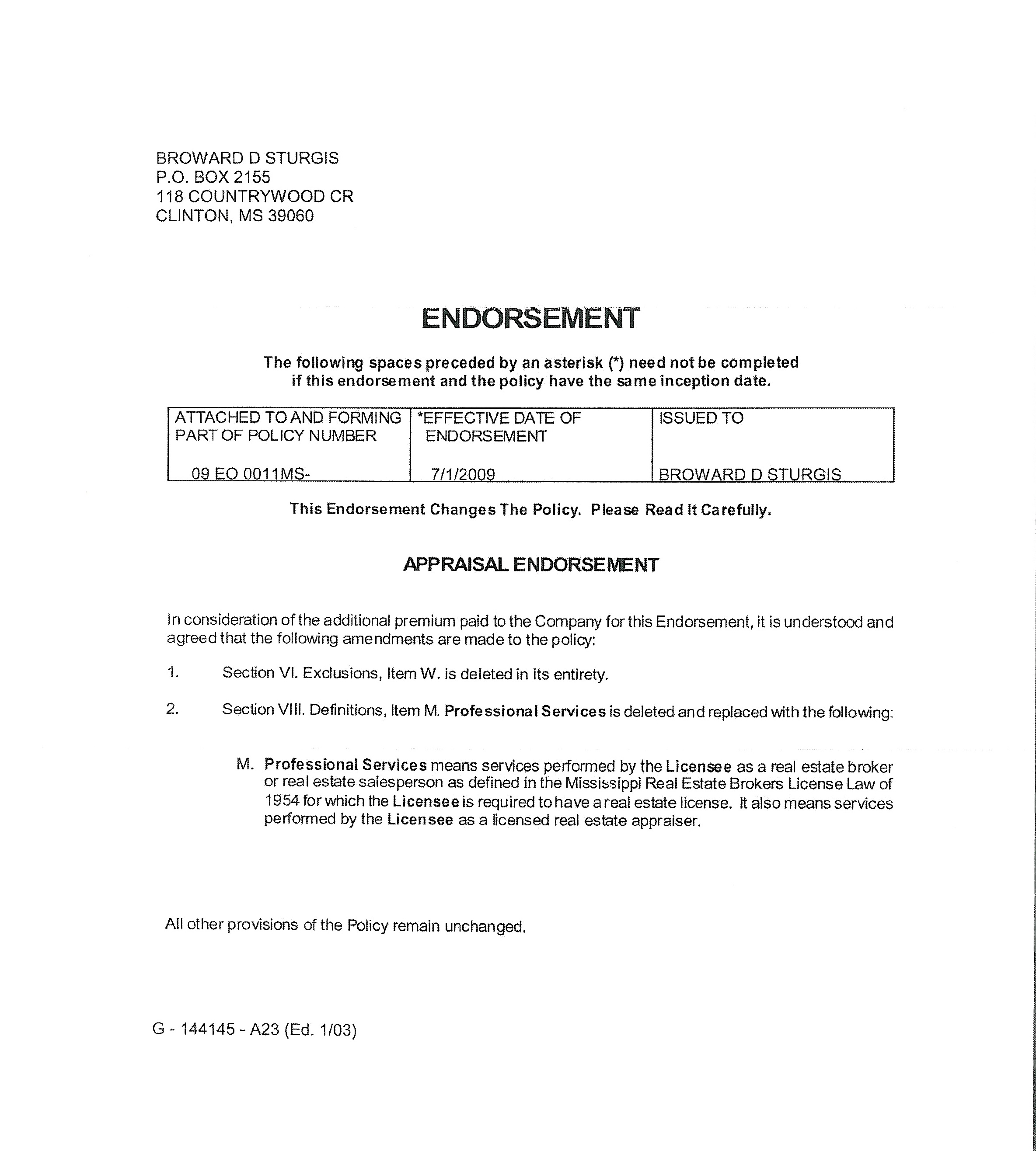 Appraisal Endorsement 2009